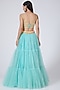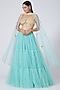 Featuring a blue lehenga in net and dupion base with sequin embroidery. It paired with a contrasting blouse and a net dupatta.