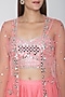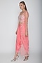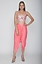 Featuring a blush pink blouse in dupion base with mirror embroidery. It is paired with matching drape dhoti pants in rayon satin base and net cape.