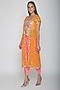 Featuring a blush pink blouse in dupion base with mirror embroidery. It is paired with matching drape dhoti pants in rayon satin base and orange net cape.