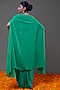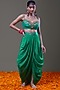 Featuring a dark mint cape in georgette base with gota work. It is paired with a matching embroidered draped skirt having an attached belt and a dupion blouse.
