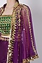Featuring a green blouse in dupion base with gold mirror embroidery. It is paired with a contrasting purple satin skirt and a tulle cape. Perfect wear for festive occasions or wedding ceremonies.
