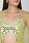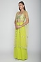 Featuring a lime green blouse in dupion base with mirror embroidery. It is paired with matching palazzo pants in rayon satin base and net cape.