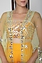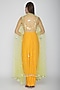 Featuring a mango yellow blouse in dupion base with mirror embroidery. It is paired with a matching drape dhoti skirt in rayon satin base and lime yellow net cape.