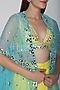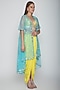 Featuring a yellow blouse in dupion base with mirror embroidery. It is paired with a matching draped dhoti skirt in rayon satin base and sky blue net cape.