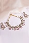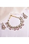 Featuring an antique gold finish choker necklace studded with pastel pink stones, zircons and uncut kundan polki, including an adjustable thread closure, set in mixed metal. It is paired with a matching pair of earrings having a push-back closure. This jewellery elevates weddings, parties and festive looks, style it with embellished outfits and heels for a refined, glamorous finish.