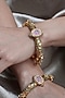 Featuring a pair of gold finish temple bangles with green and pink stones, including nakshi work, set in mixed metal. Add a touch of sparkle to your ensemble, perfect for festive occasions, weddings or sangeet ceremony.