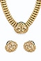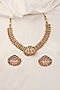 Featuring a gold finish temple necklace studded with green stones, set in mixed metal. It is paired with a matching pair of earrings. Ideal for weddings, festive celebrations or formal evening occasions.