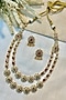 Featuring a gold finish temple layered necklace studded with multi-colored stones, set in mixed metal. It is paired with a matching pair of earrings. Perfect choice for festive celebrations or other Indian festivities.