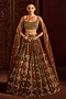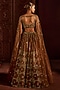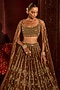 Featuring a mocha brown lehenga in net base with embroidery. It is paired with an embroidered blouse having cape sleeves. Accentuate the designer lehenga with kundan polki or gold jewellery, embellished heels and a potli bag for a bridal look, Perfect wear for your wedding, sangeet or engagement ceremony.