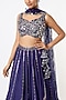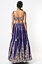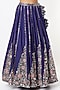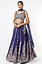 Featuring a royal blue lehenga in tussar blend base with mirror, applique, thread, sequins embroidery. It is paired with a matching silk blouse and a tulle scalloped dupatta.