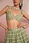 Featuring a sage green lehenga in organza and silk base with sequins and zardosi embroidery. It is paired with a net blouse and an organza dupatta. Accentuate it with statement earrings and heels for a wedding, sangeet or engagement ceremony.
