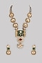 Featuring a gold finish long necklace studded with kundan polki, emerald and ruby, set in mixed metal. It is paired with a matching pair of earrings. Perfect wear for festive occasions or wedding ceremony.