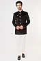 Featuring a brown bandhgala jacket in a suede velvet base with gold detailing. It is paired with contrasting white pants.