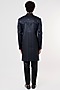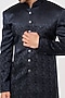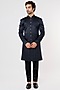 Featuring a cobalt blue sherwani in a jacquard base with patchwork. It is paired with contrasting black pants.