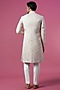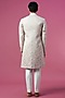 Featuring a peach sherwani in jacquard base. It is paired with contrasting ivory trousers.