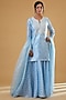 Featuring a blue kurta in kora silk base with block print, floral and cutdana embroidery. It is paired with printed sharara pants and an organza dupatta having print and embroidery. Accentuate with statement jewellery and heels for a wedding or festive occasion.