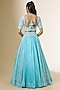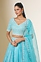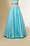 Featuring a blue lehenga in kora silk base with print. It is paired with an embroidered blouse and an organza dupatta. Accentuate with statement earrings and heels for weddings or sangeet ceremonies.