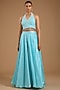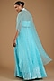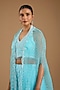 Featuring a blue cape in organza base with embroidery. It is paired with an embroidered blouse and a printed kora silk skirt. Accentuate it with dangler earrings and heels for a festive occasion, engagement or sangeet ceremony.