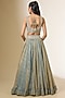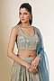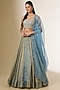 Featuring a blue lehenga in tissue organza base with ajrakh print. It is paired with an embroidered blouse and an organza dupatta. Accentuate with statement earrings and heels for weddings or sangeet ceremonies.