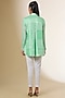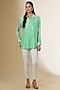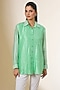 Featuring a sea green shirt in silk base with block print and zardosi embroidery. Balance the structure with tailored pants and sleek heels for effortless elegance.