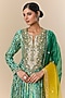 Featuring a green and yellow kurta in kora silk base with tie-dye print, including floral, resham, sequins and zardosi embroidery. It is paired with pants an organza embroidered dupatta. Accentuate it with silver jewellery, heels and a clutch for festive occasions or mehendi ceremonies.