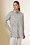 Featuring a grey shirt in linen base with block print and zardosi embroidery. Balance the structure with tailored pants and sleek heels for effortless elegance.
