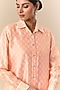 Featuring a light peach shirt in kora silk base with base with block print, floral and zardosi embroidery. Accentuate it with pants, hoop earrings and heels for casual outings, sundowner or evening wear.