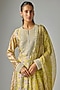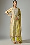 Featuring a yellow kalidar kurta in kora silk base with ajrakh print and crystal embroidery. It is paired with pants, including an organza dupatta having print and scalloped embroidery. Accentuate it with stud earrings and flat mules for an easy-going everyday look, perfect for festive occasions, pooja ceremonies, or haldi functions.