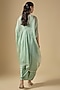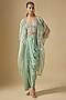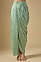 Featuring an aqua cape in organza base with dori work. It is paired with a silk blouse and a modal satin skirt. Accentuate it with polki earrings and block heels for a festive occasion, sangeet or pre-wedding ceremony.