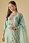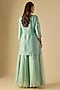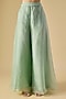 Featuring an aqua blouse in silk base with resham and maal work. It is paired with an organza cape and sharara pants. Accentuate it with minimal jewellery and heels for a festive look.
