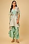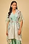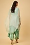 Featuring an aqua cape in organza base with thread work. It is paired with a silk handkerchief kurta, cotton satin pants and a belt. Accentuate it with minimal jewellery and heels for a festive look.