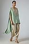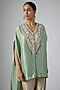 Featuring an aqua kaftan in silk base with moti and resham embroidery. It is paired with smoke cotton satin pants. Accentuate it with kundan polki jewellery and block heels for festive occasion, pooja or family gatherings.