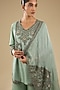 Featuring an aqua kurta in silk base with green thread work. It is paired with sharara pants and an organza dupatta. Accentuate this with statement chandelier earring and metallic heels for a refined ensemble, ideal for festive celebrations or wedding functions.