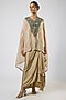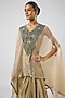 Featuring a champagne umbrella V-neck kaftan in crushed tissue base with thread embroidery. It is paired with a cotton lycra bustier and modal satin skirt. Accentuate with kundan stud earrings, a potli bag and heels for a festive occasion, mehendi or sangeet ceremonies.