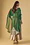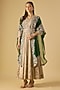 Featuring a beige anarkali in tissue base with gota work. It is paired with bottle green organza cape, cotton satin pants and a belt. Accentuate it with minimal jewellery and heels for a festive look.