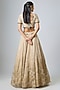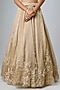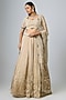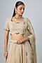 Featuring a beige lehenga in tissue base with resham work. It is paired with a blouse and a dupatta. Accentuate the designer lehenga with statement jewellery and heels for a sangeet or engagement ceremony.
