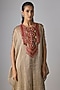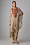 Featuring a beige kaftan in tissue base with thread work. It is paired with a cotton lycra bustier and cotton satin pants. Accentuate it with dangler earrings and heels for festive wear or wedding ceremonies.