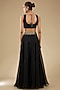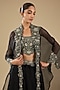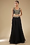 Featuring a black cape in organza base with green thread work. It is paired with a silk blouse and a skirt. Accentuate it with statement gold or kundan jewellery, a sleek low bun and metallic heels for a refined look, ideal for cocktail evenings, wedding festivities or festive celebrations.