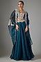 Featuring a blue cape in organza base with resham and moti work. It is paired with a silk embroidered blouse and a skirt. Accentuate the set with statement jewellery, embellished heels and a clutch for an elegant look, Perfect for your cocktail, sangeet or engagement ceremony.