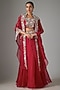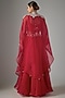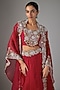 Featuring a red cape in organza base with threadwork. It is paired with a silk embroidered blouse and a skirt. Accentuate the set with statement jewellery, embellished heels and a clutch for an elegant look, Perfect for your cocktail, sangeet or engagement ceremony.