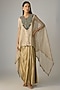 Featuring a champagne kaftan in crushed tissue base with dori and thread work. It is paired with a cotton lycra bustier and a modal satin skirt. Accentuate it with stud earrings and heels for festive wear or wedding ceremonies.