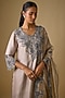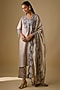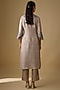 Featuring a champagne kurta in silk base with antique work. It is paired with cotton satin pants and a tissue dupatta. Accentuate it with kundan polki jewellery and heels for a festive occasion or pooja ceremony.