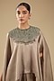 Featuring a champagne kaftan in silk base with green thread work. It is paired with a modal satin skirt. Accentuate it with statement chandelier earrings, a sleek low bun and metallic heels for a refined ensemble, ideal for festive celebrations, wedding functions, or evening soirees.