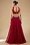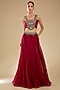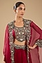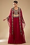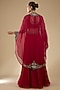 Featuring a cherry red cape in organza base with green thread work. It is paired with a silk blouse and a skirt. Accentuate it with statement gold or kundan jewellery, a sleek low bun and metallic heels for a refined look, ideal for cocktail evenings, wedding festivities or festive celebrations.