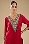 Featuring a cherry red kurta in silk base with green thread work. It is paired with pants. Accentuate it with statement silver or antique gold earrings and embellished heels or juttis for a refined look, ideal for festive gatherings, evening soirees or intimate celebrations.