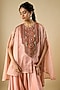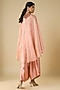 Featuring a dark flamingo pink kaftan in tissue base with thread work. It is paired with a cotton lycra bustier and cotton satin pants. Accentuate it with polki jewellery, a soft braided hairstyle and juttis for a timeless festive look.