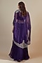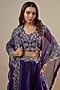 Featuring a dark purple cape in organza base with dori and sutta work. It is paired with a silk embroidered blouse and a skirt. Accentuate with statement earrings and heels for any festive occasion or wedding ceremonies.