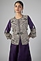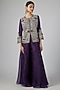 Featuring a dark purple jacket in silk and organza base. It is paired with sharara pants. Accentuate it with statement earrings and heels for sangeet ceremonies.