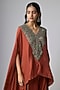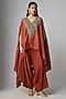 Featuring a dark rust kaftan in crushed silk and cotton satin base. It is paired with pants. Accentuate it with stud earrings, a polti bag and juttis for festive occasions or cultural ceremonies.