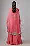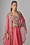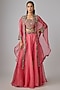 Featuring a deep coral blouse in silk base with thread work. It is paired with an organza skirt and a cape. Accentuate it with dangler earrings and heels for festive wear, sangeet or wedding ceremonies.